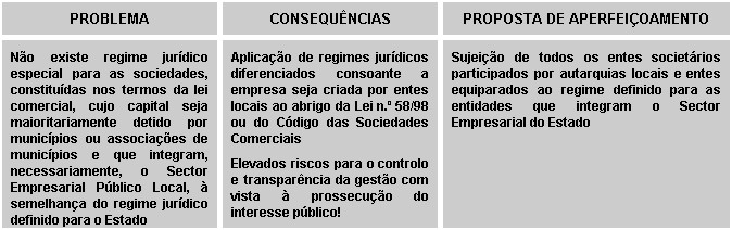 Nesta sequência, a ausência de um conjunto de regras disciplinadoras de actuação dos municípios e associações de municípios, quando gerem sob vestes jurídico-privadas, poderá potenciar a preferência de criação de entes empresariais ao abrigo do direito societário, em detrimento dos tipos e formas jurídicas legalmente contempladas na Lei das Empresas Municipais e Intermunicipais, diminuindo, desse modo, as garantias de acompanhamento e controlo de prossecução do interesse público pelos órgãos fiscalizadores (assembleia municipal ou assembleia intermunicipal, consoante o caso) e pelas entidades de controlo.