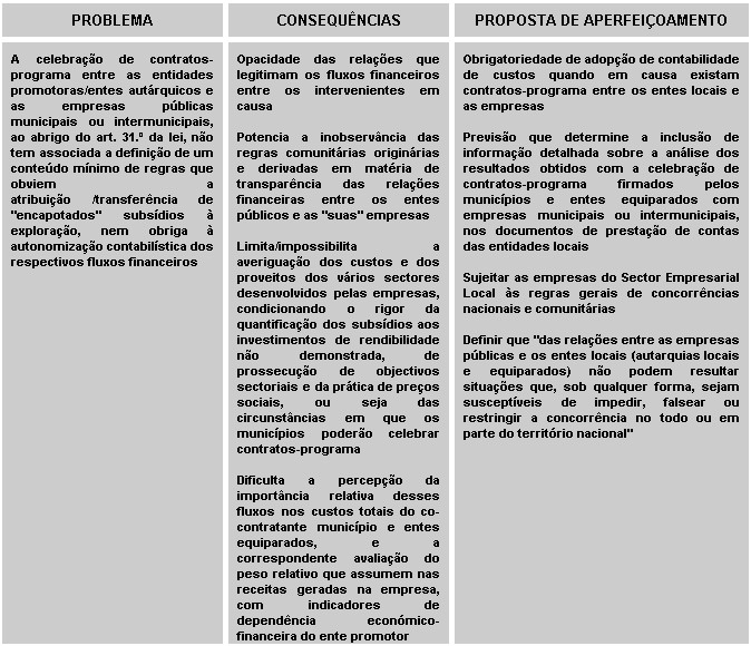 Destacamos, assim, a necessidade de instituir regras claras de acompanhamento e controlo do desempenho das empresas no relevante papel de prestação de serviços públicos à comunidade local, o que poderá passar pela definição de um conjunto mínimo de princípios que devem presidir à celebração de contratos-programa entre as partes e a adopção obrigatória da contabilidade de custos, por forma a garantir a transparência dos fluxos financeiros entre os entes em questão.