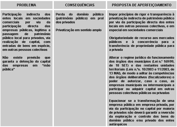 Assim, a transformação de uma empresa pública em empresa privada, por via da participação no capital por maioria de privados, deveria garantir a reversão, para a administração local, da exploração e controlo de bens do domínio público e/ou privado dos entes locais.