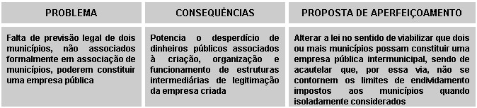 A propósito, ainda, da duplicação de estruturas e custos, repare-se que a lei não prevê a faculdade de dois municípios constituírem uma empresa pública.