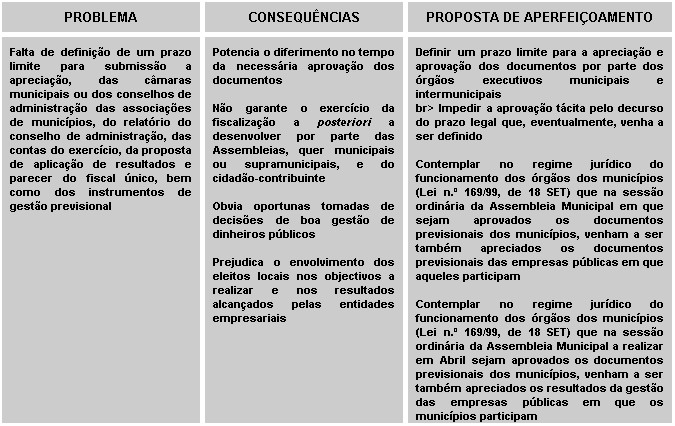 Esta omissão potencia, quer a submissão, a apreciação dos órgãos autárquicos, desfasada dos instrumentos de prestação de contas dos seus promotores, prejudicando, alegadamente, oportunas decisões de gestão, nomeadamente em sede de directivas e instruções genéricas destinadas ao conselho de administração, quer a própria não apreciação, e consequente não aprovação, bem como a aprovação tácita, decorrido o prazo estatutariamente definido.